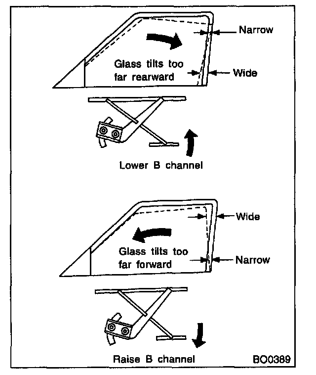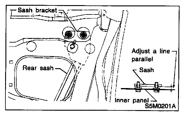 CAUTION: Do not tilt sash bracket to inner panel during adjustment. Otherwise smooth regulator operation cannot be achieved.