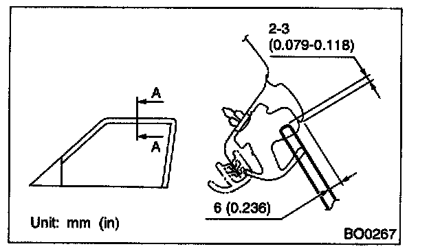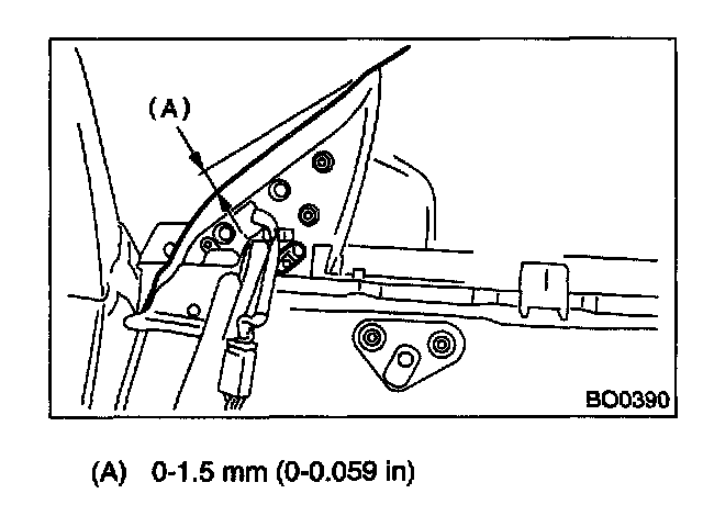 4. For adjustment of clearance between front glass and center pillar cover, loosen the nuts (A), and move the glass sash back and forward until clearance becomes the value shown.