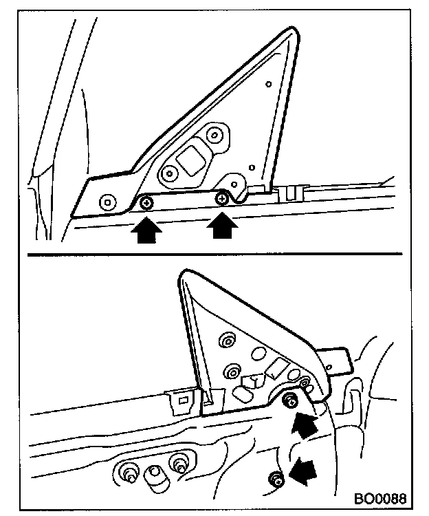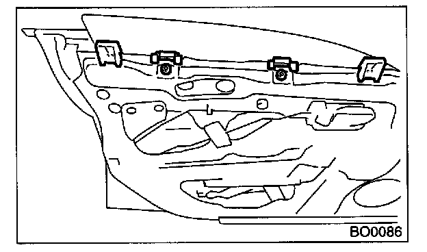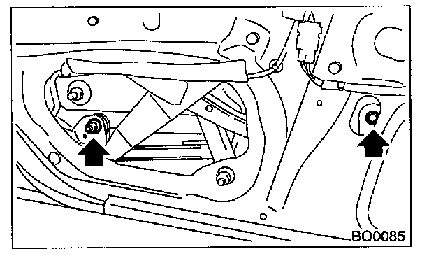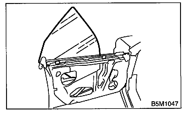 7. Operate the power window switch to move glass to position shown in the image, and then remove the two nuts from the service holes.
