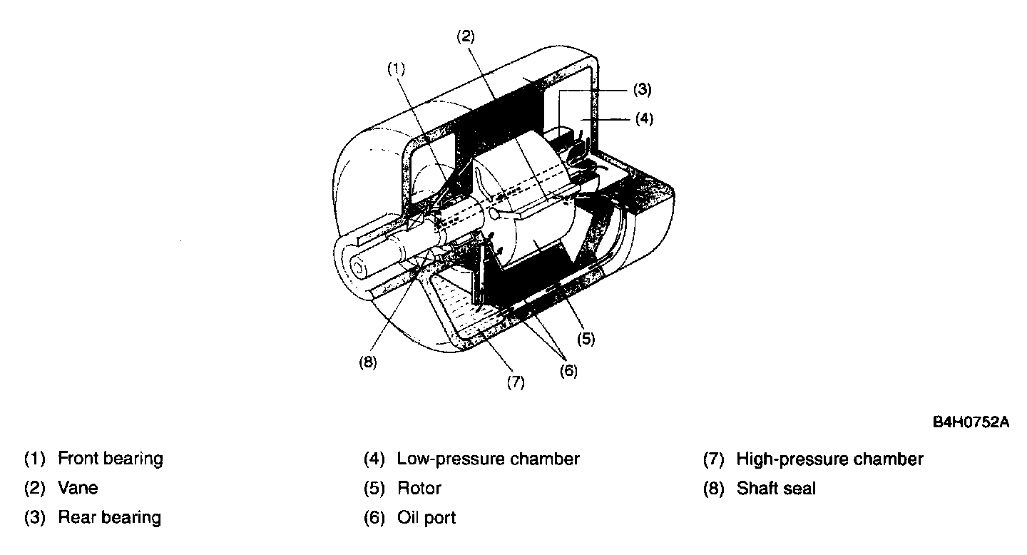 The lubrication oil is collected at the bottom of the high-pressure chamber. The high-refrigerant pressure in the chamber forces the oil upward through the oil passages in the front side block to lubricate the front end of the rotor. The high-chamber pressure also forces the oil through the passages in the bottom of the cylinder to lubricate the rear end of the rotor. The oil that has lubricated each end of the rotor enters the low-pressure chamber by the internal pressure of the compressor. The oil contained in the gaseous refrigerant from the evaporator passes through the low-pressure chamber and lubricates the rear bearing. The oil also passes through the passage in the drive shaft and lubricates the front bearing and shaft seal before entering the suction port of the cylinder. Since the pressure in the suction port of the cylinder is slightly lower than that in the low-pressure chamber, the oil that has lubricated all the parts enters the suction port and is finally brought by the refrigerant back to the high-pressure chamber.