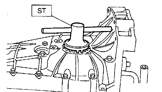 10. Screw retainer assembly into left case from the bottom with ST2. Fit ST3 on the transmission main shaft. Shift gear into 4th or 5th and turn the shaft several times. Screw in the retainer while turning ST3 until a slight resistance is felt on ST2. This is the contact point of hypoid gear and drive pinion shaft. Repeat the above sequence several times to ensure the contact point.