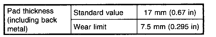^ A wear indicator is provided on the inner disc brake pad. If the pad wears down to such an extent that the end of the wear indicator contacts the disc rotor, a squeaking sound is produced as the wheel rotates. If this sound is heard, replace the pad.