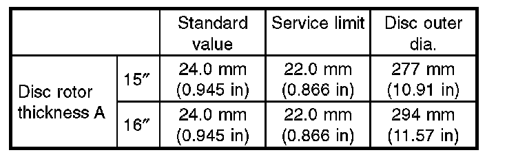3. Measure disc rotor thickness. If thickness of disc rotor is below service limit, replace disc rotor.