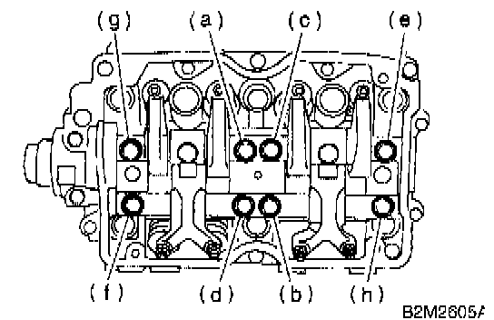 CAUTION: Leave two or three threads of bolts (g and h) engaged to retain valve rocker assembly.