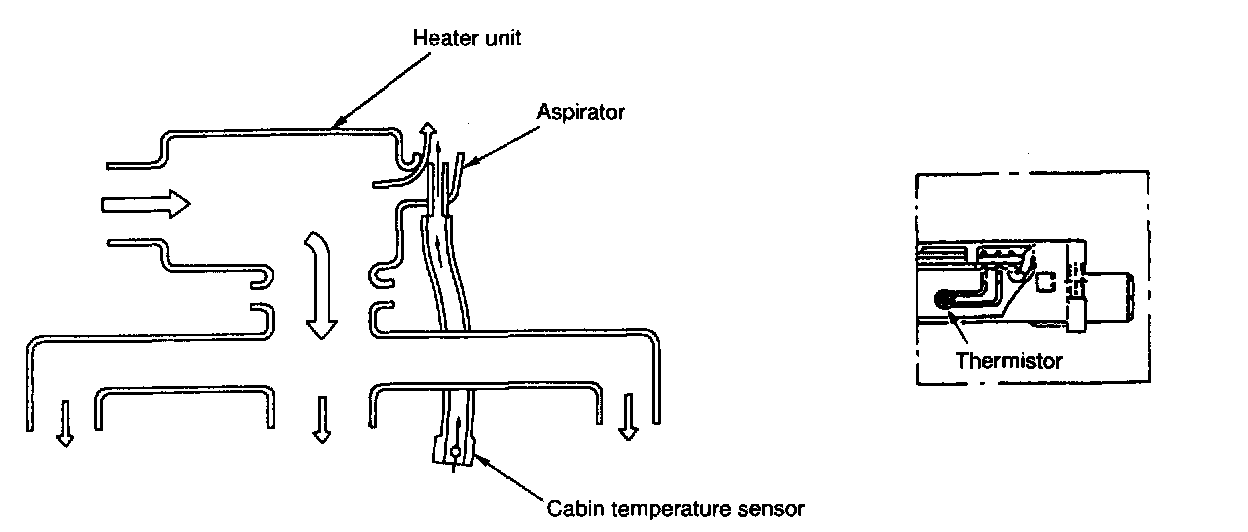 This sensor consists of an aspirator and a thermistor, the resistance of which changes in inverse proportion to the temperature. The aspirator uses the vacuum created by the heater unit to direct cabin air to the thermistor. (The cabin temperature sensor, therefore, functions only while the blower fan is in operation.)
