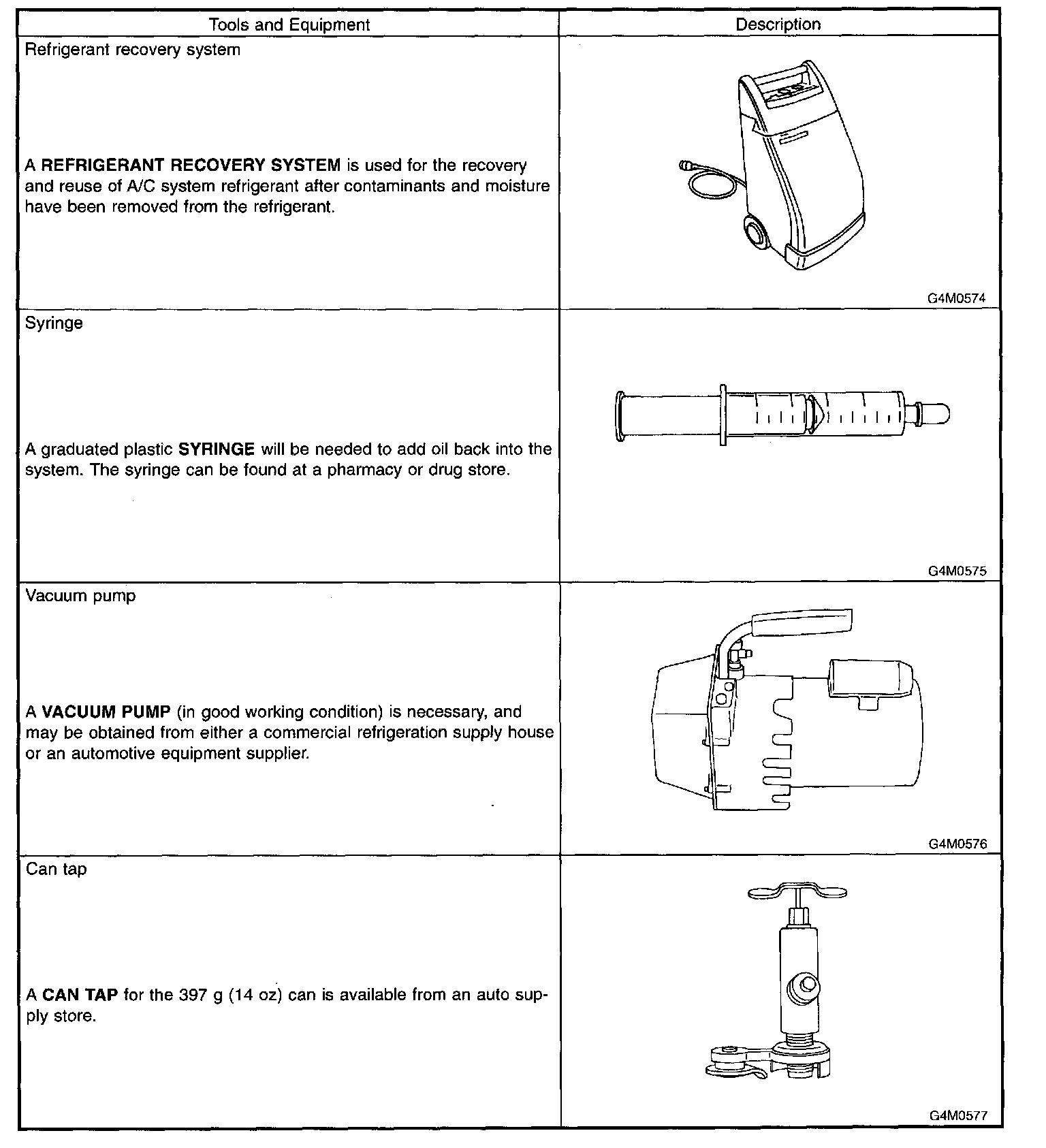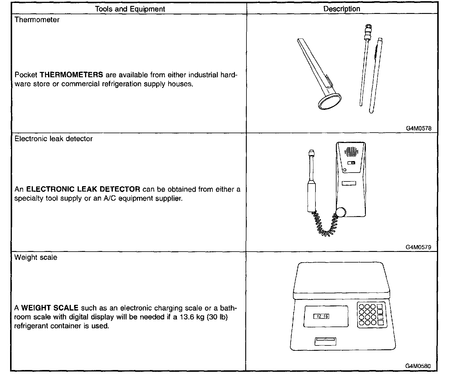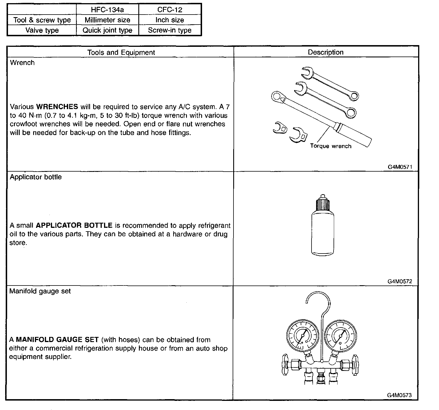 In order to help prevent mixing HFC-134a and CFC-12 parts and liquid, the tool and screw type and the type of service valves used are different. The gas leak detectors for the HFC-134a and CFC-12 systems must also not be interchanged.