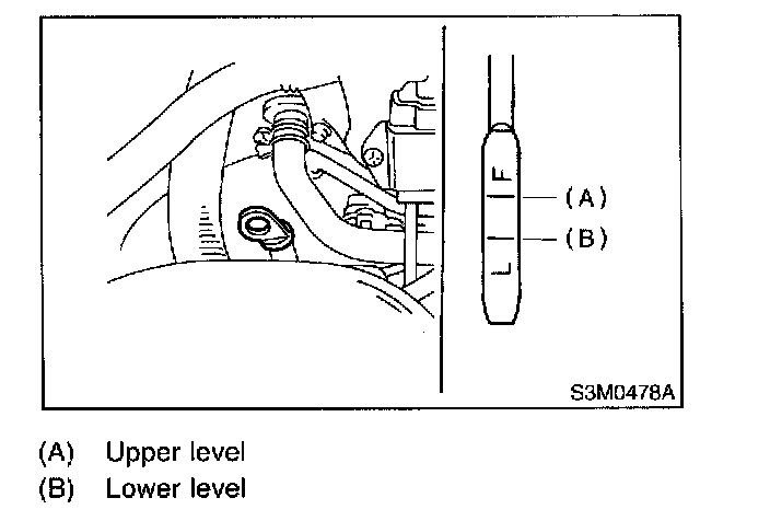 4. Remove it again and note the reading. If the differential gear oil level is below the "L" line, add oil to bring the level up to the "F" line.