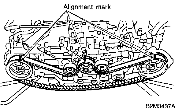 When installing the timing belt, be sure to align all alignment marks on the belt with corresponding marks on the sprockets. If incorrectly installed, interference between pistons and valves may occur.