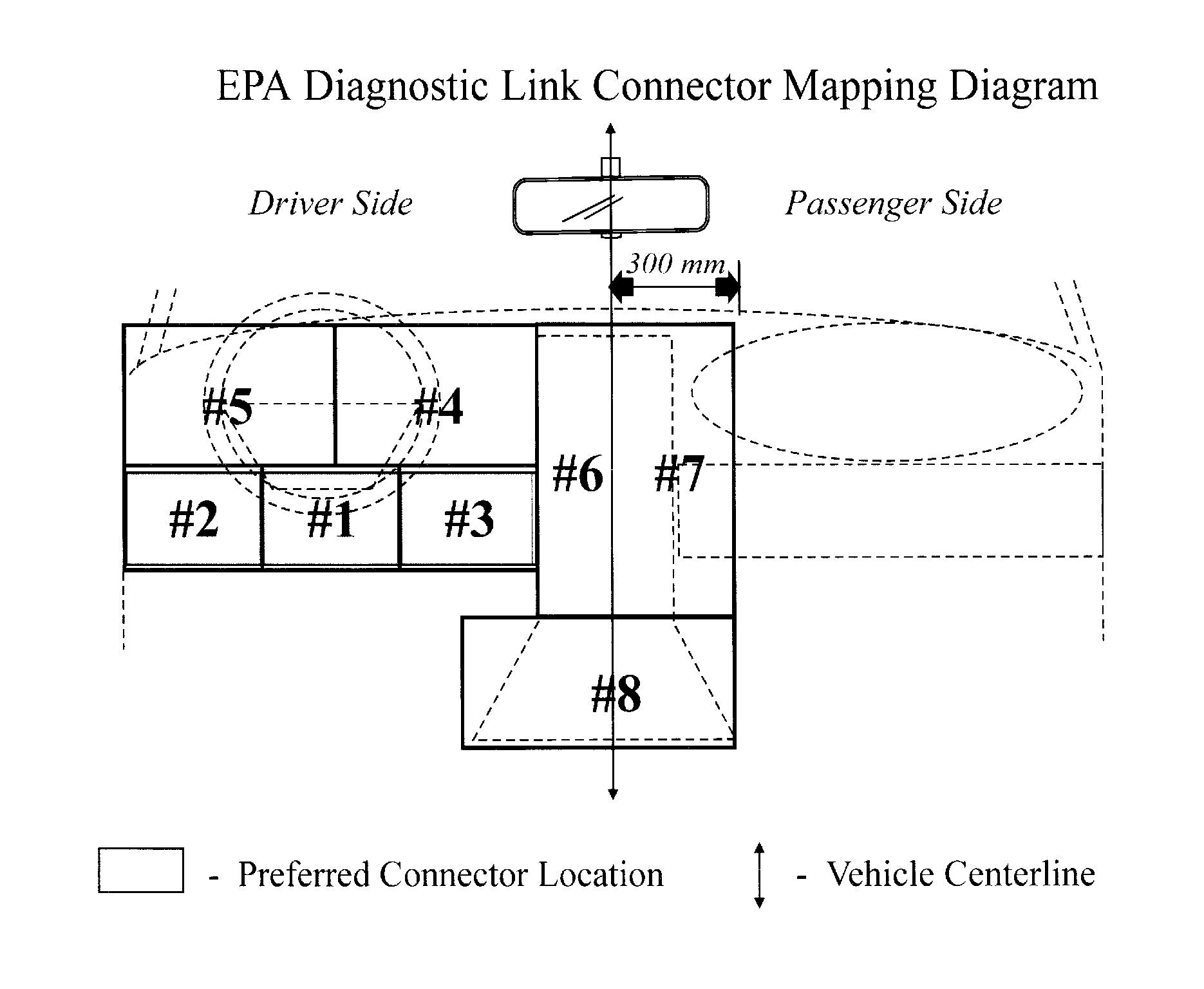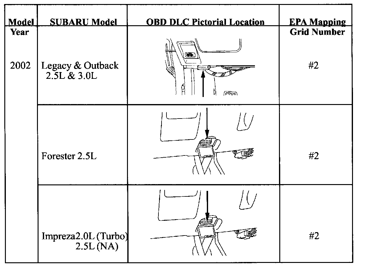 Summarized in the chart shown is a pictorial reference for the Diagnostic Link Connector (DLC) location by 2002 model line. The USEPA's Diagnostic Link Connector mapping grid is shown.