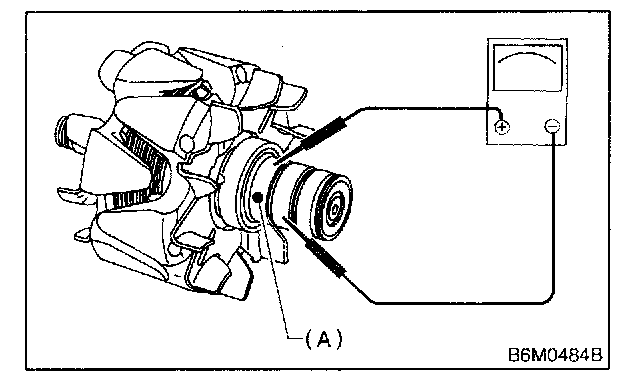 Check continuity between slip ring (A) and rotor core (B) or shaft. If the measured resistance is 1 MOhm or less, replace rotor.