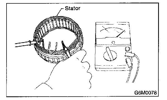 Inspect stator coil for continuity between stator core and each terminal. If there is continuity (1 Ohm or less), replace stator coil.