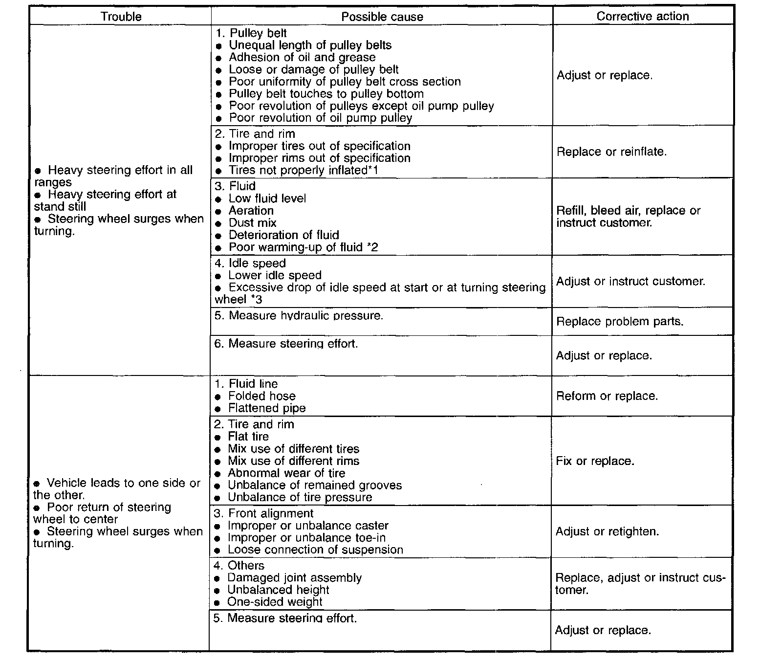 *3 In cold weather or with insufficient engine warm-up, steering effort may be heavy due to excessive drop of idle speed when turning steering wheel. In this case, it is recommended to start the vehicle with a faster engine speed than usual. Then if steering effort reduces normally, there is no abnormality.