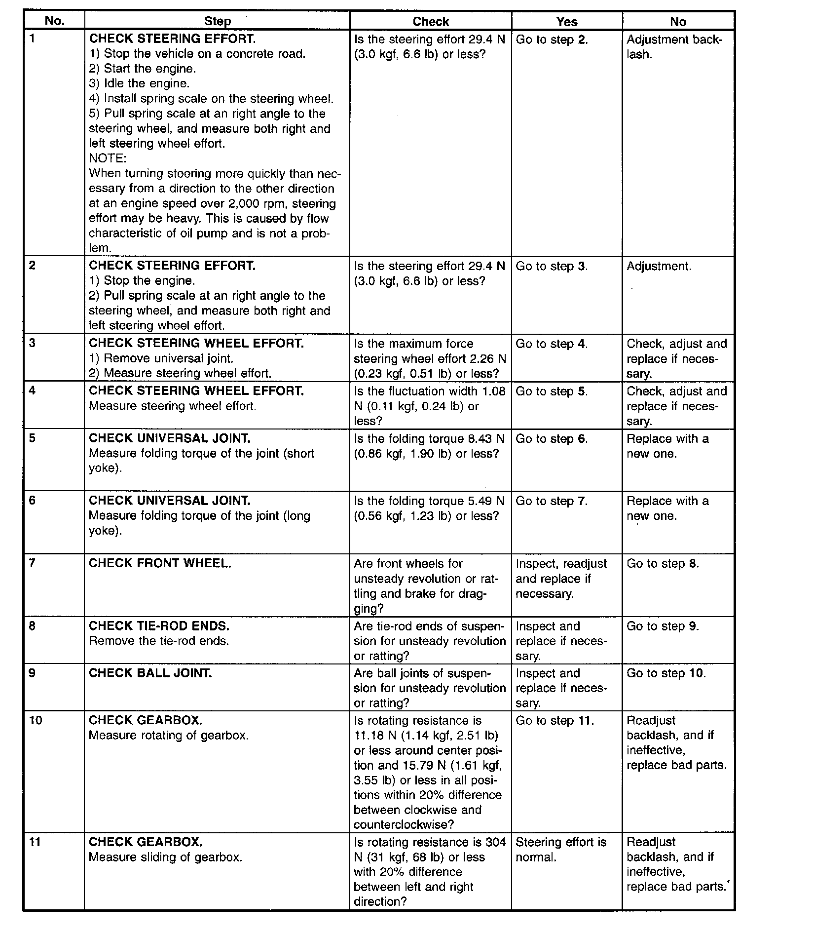 *2 In cold weather, steering effort may be heavy due to increased flow resistance of cold fluid. After warming-up engine, turn steering wheel from stop to stop several times to warm-up fluid. Then if steering effort reduces normally, there is no abnormality.