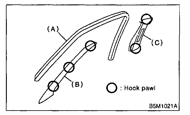 CAUTION: Be sure to securely hook pawls of inner trim panel to body flange.