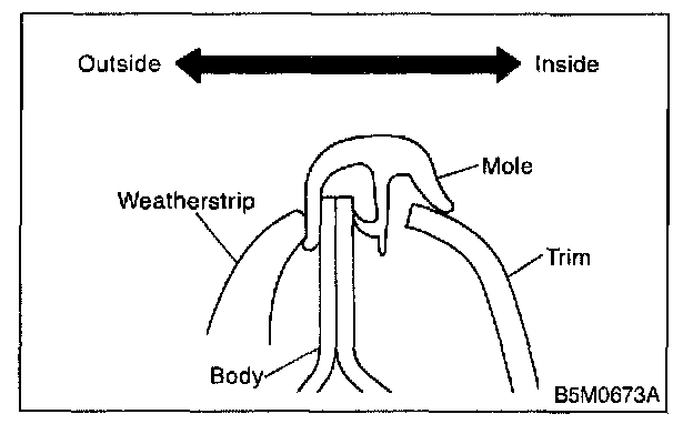 NOTE: When installing center pillar upper trim and front pillar upper trim, be sure to set front mole as shown in figure.