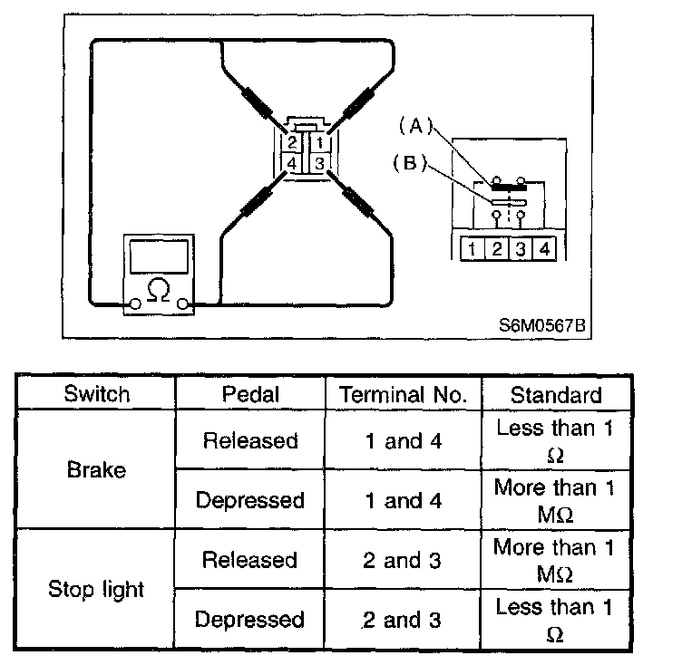 Measure the brake switch (A) and stop light switch (B) resistance.