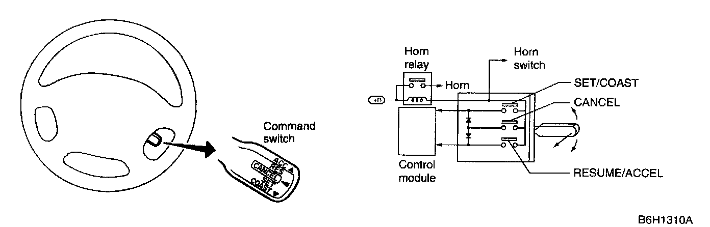 - When the vehicle is driven with the cruise control activated, the command switch controls its operation. It inputs SET/COAST signal, ACCEL/RESUME signal or CANCEL signal to the cruise control module.