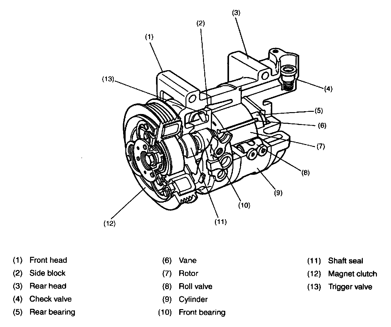 On the discharge side of the cylinder, a roll valve is provided that opens at a predetermined high pressure. Air tightness between the rotor shaft and front head is ensured by the shaft seal. The trigger valve incorporated in the front side block provides the function of applying back pressure to the vanes. The compressor contains necessary quantity of compressor oil. The oil is distributed to all the parts requiring lubrication and sealing by utilizing the discharge pressure of the refrigerant.