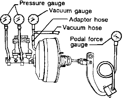 While the engine is idling, depress the brake pedal with a 490 N (50 kgf, 110 lb) load and measure the distance between the brake pedal and steering wheel. With the brake pedal released, measure the distance between the pedal and steering wheel again. The difference between the two measurements must be more than specified.