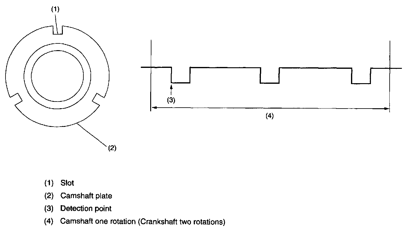 - The sensor generates a pulse when one of the slots on the back of the right-hand camshaft plate passes in front of the sensor. The ECM detects the camshaft position by measuring the pulse. Three slots are provided on the plate as shown above.