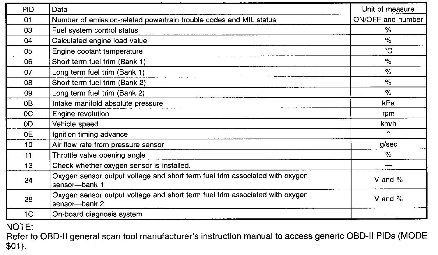 Refers to data denoting the operating condition when trouble is sensed by the on-board diagnosis system. A list of the support data and PID (Parameter Identification) codes are shown in the above table.
