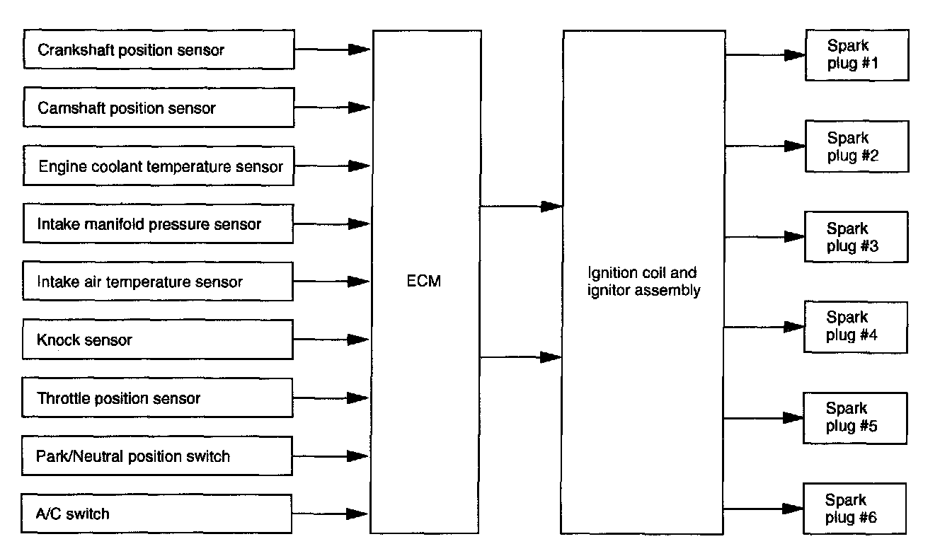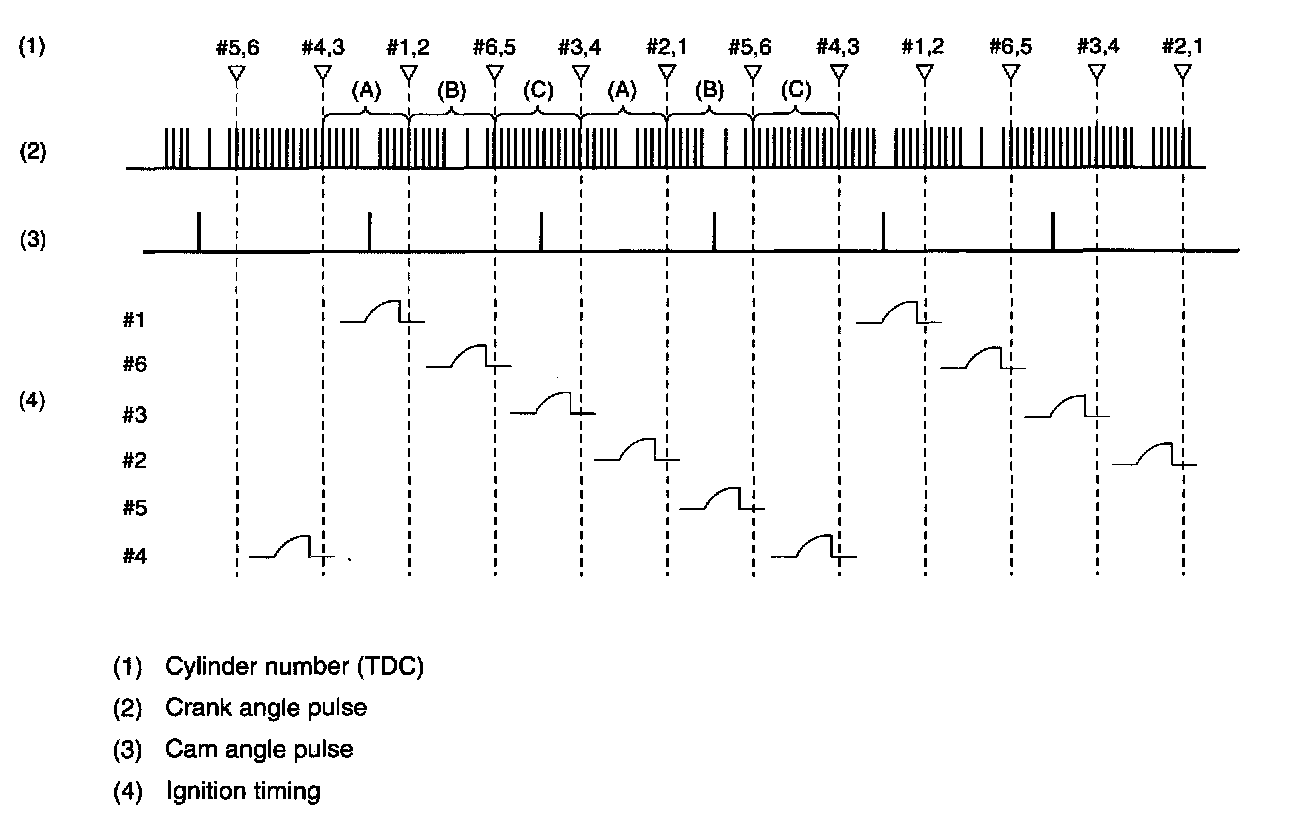 - The ECM outputs an ignition signal for the No.1, No.3 or No.5 cylinder when it receives a camshaft angle pulse before a TDC signal and for the No.2, No.4 or No.6 cylinder when it receives no camshaft angle pulse before a TDC signal.