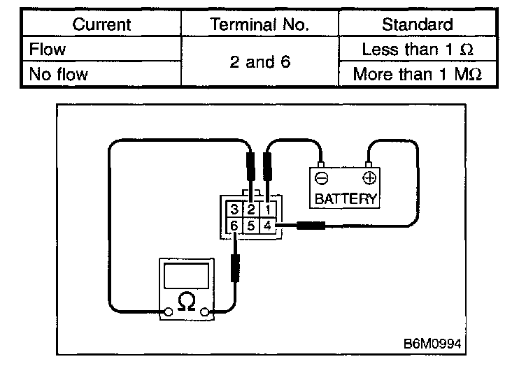 Measure the interrupt relay resistance between terminals (indicated in the table) while connecting terminal No.4 to battery positive terminal and terminal No.1 to battery ground terminal.