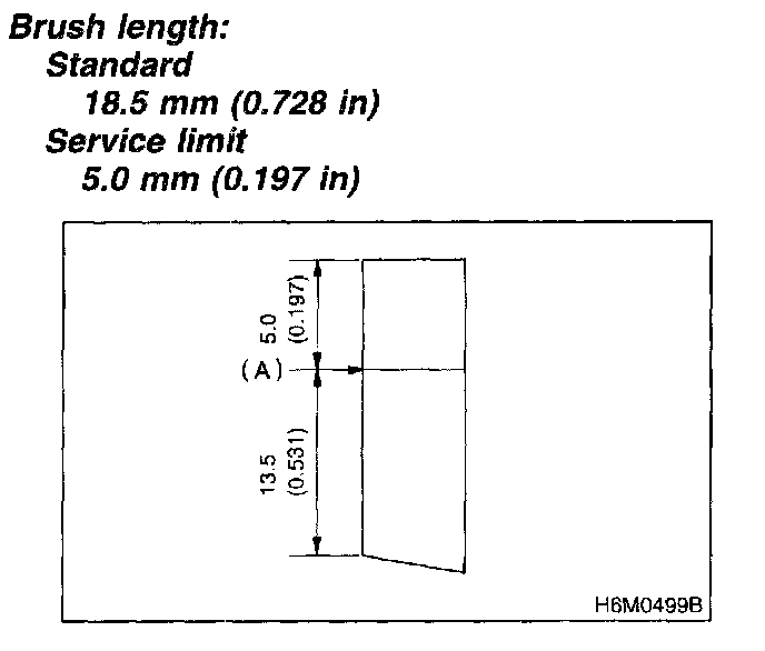 1. Measure the length of each brush. If wear exceeds the service limit, replace the brush. Each brush has the service limit mark (A) on it.