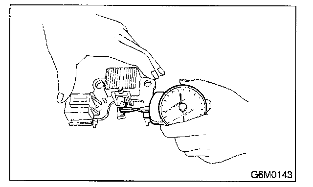 2. Checking brush spring for proper pressure Using a spring pressure indicator, push the brush into the brush holder until its tip protrudes 2 mm (0.08 in). Then measure the pressure of the brush spring. If the pressure is less than 2.648 N (270 g, 9.52 oz), replace the brush spring with a new one. The new spring must have a pressure of 4.609 to 5.786 N (470 to 590 g, 16.58 to 20.81 oz).