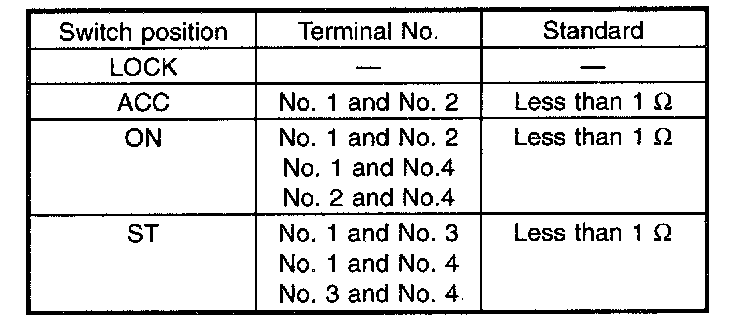 4. Turn the ignition key plate to each position and check the continuity between the terminals of the ignition connector.