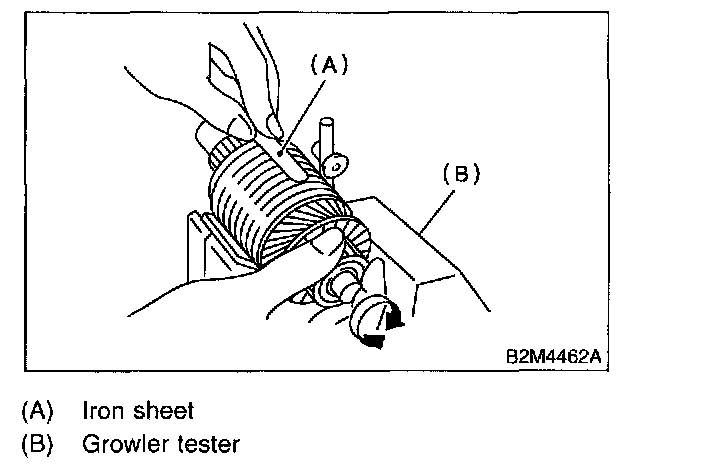 Using circuit tester, touch one probe to the commutator segment and the other to shaft. There should be resistance of 1 MOhm or more. If resistance is 1 Ohm or less, armature is grounded. Replace armature if it is grounded.