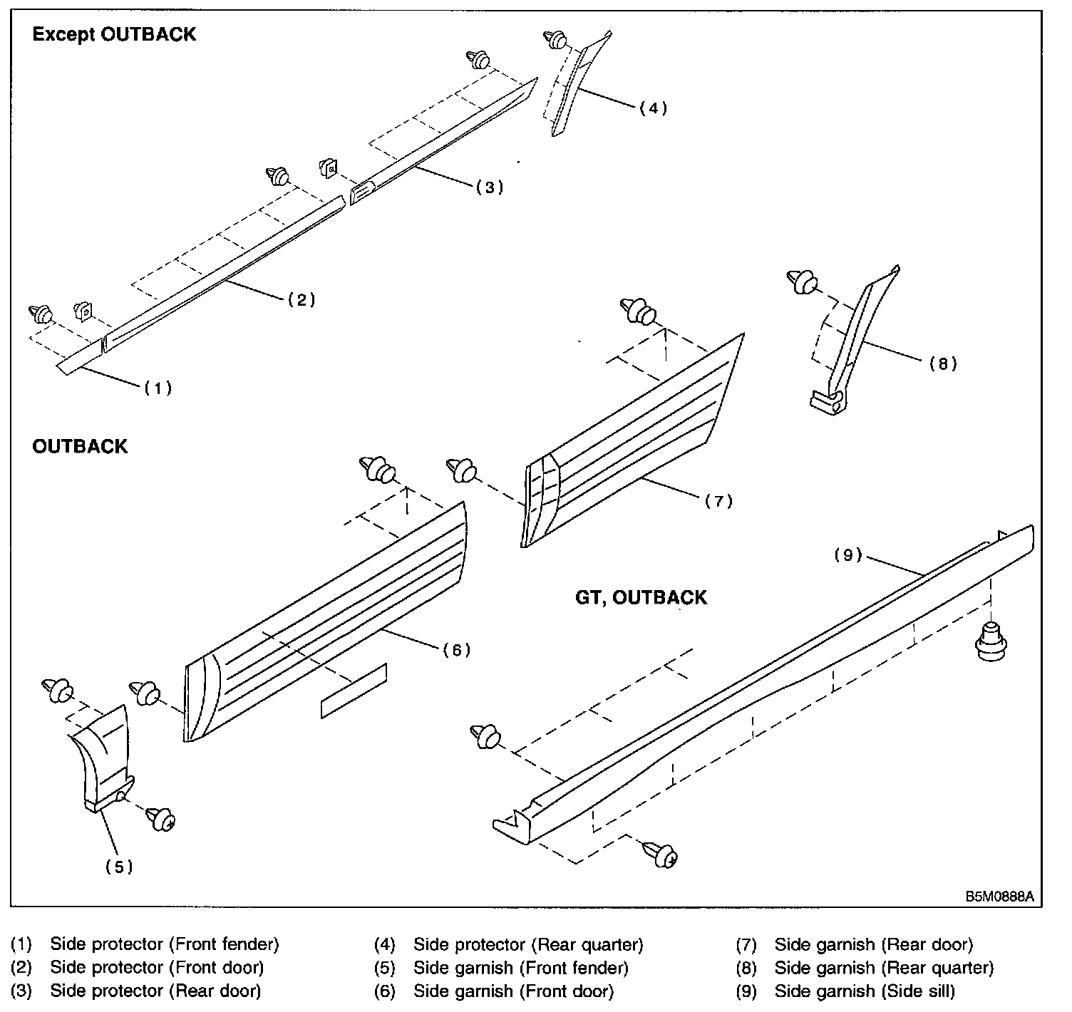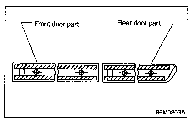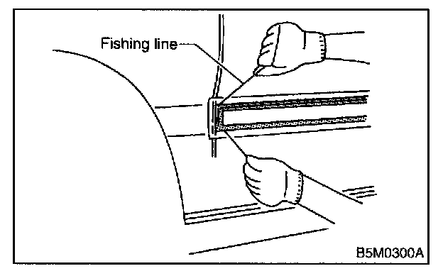 3. Insert fishing line [0.8 mm (0.31 in) dia.] between side protector and vehicle body. Cut (pull the line) through two-sided tape along side protector on the body. Using a puller, remove clips from vehicle body while pulling side protector towards yourself as required.