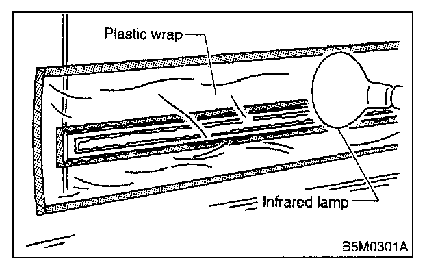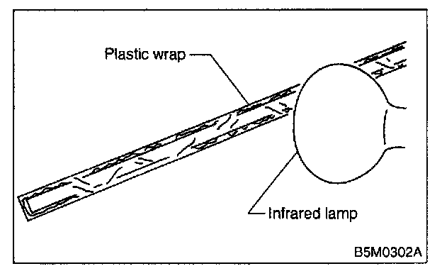 5. Attach plastic wrap to adhesive remover coated areas and heat to 40 to 60°C (104 to 140°F) for 5 to 10 minutes using an infrared lamp.