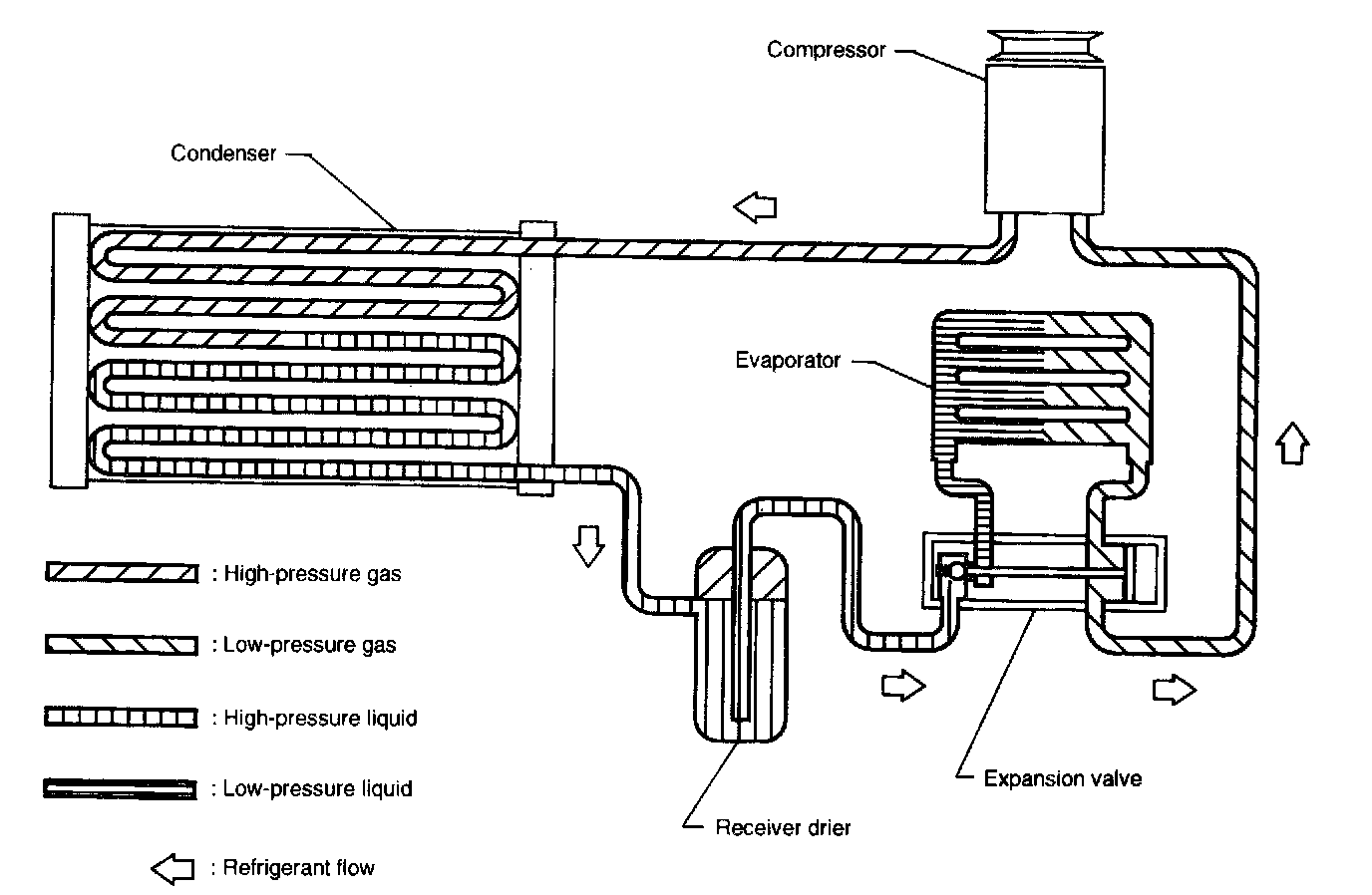 The refrigerant recirculates in the air conditioning system, flowing out of the compressor, passing through the condenser, receiver drier and evaporator, and returning to the compressor.