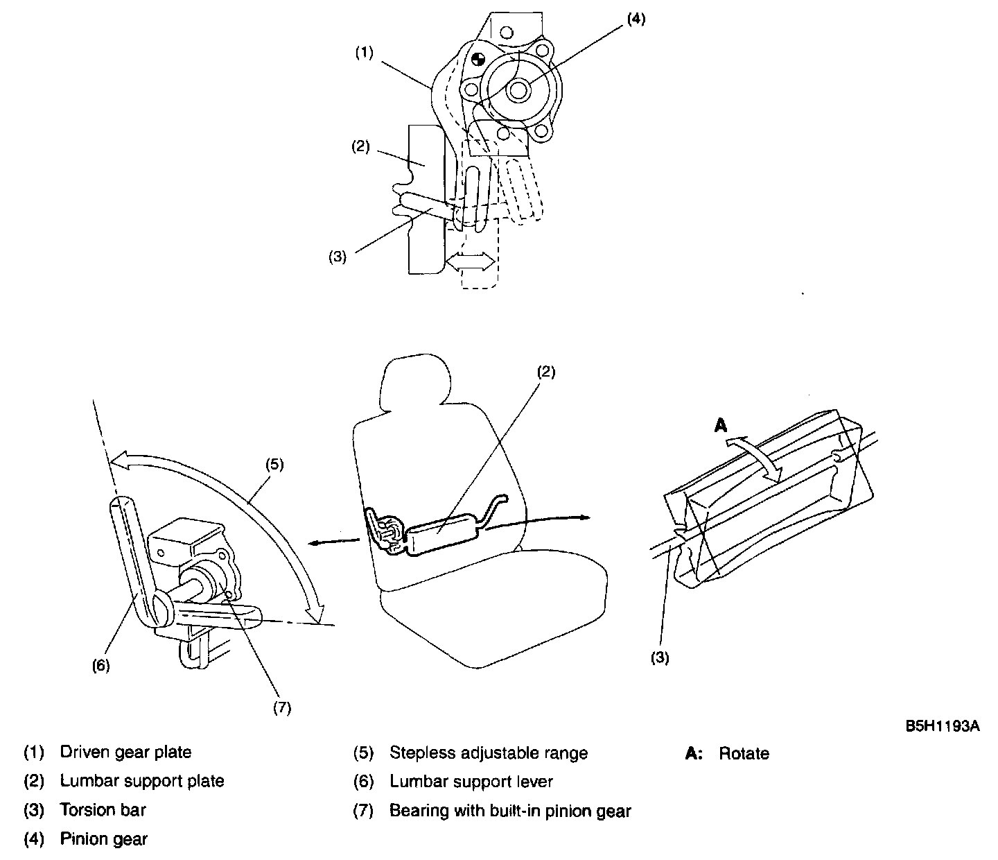 The lumbar support mechanism has been modified to feature stepless adjustment. The material of the support plate is also changed to plastic for a better fit with the occupant's back.