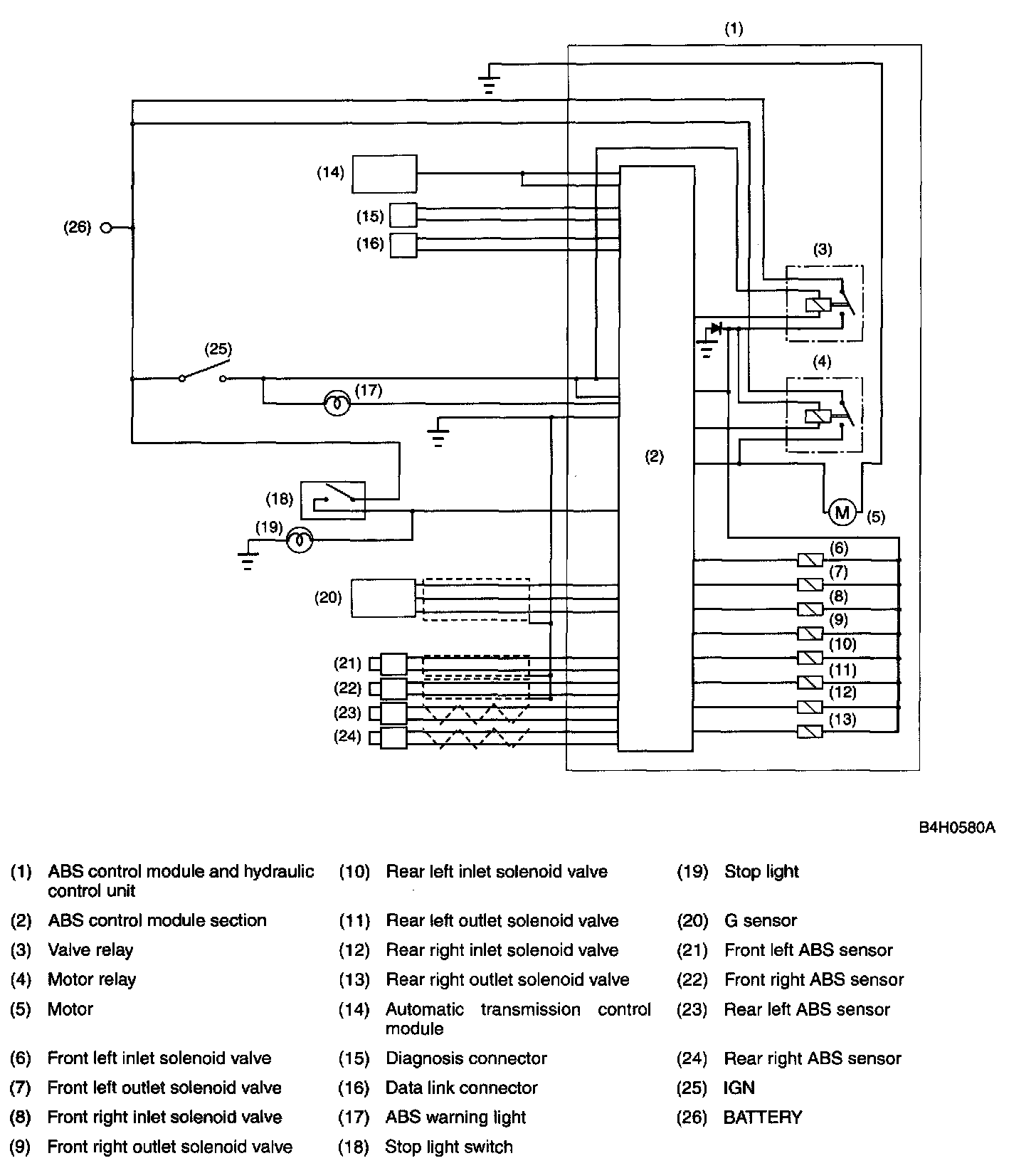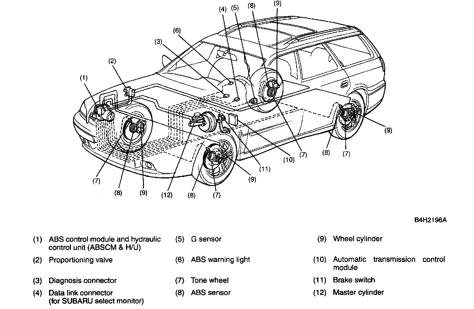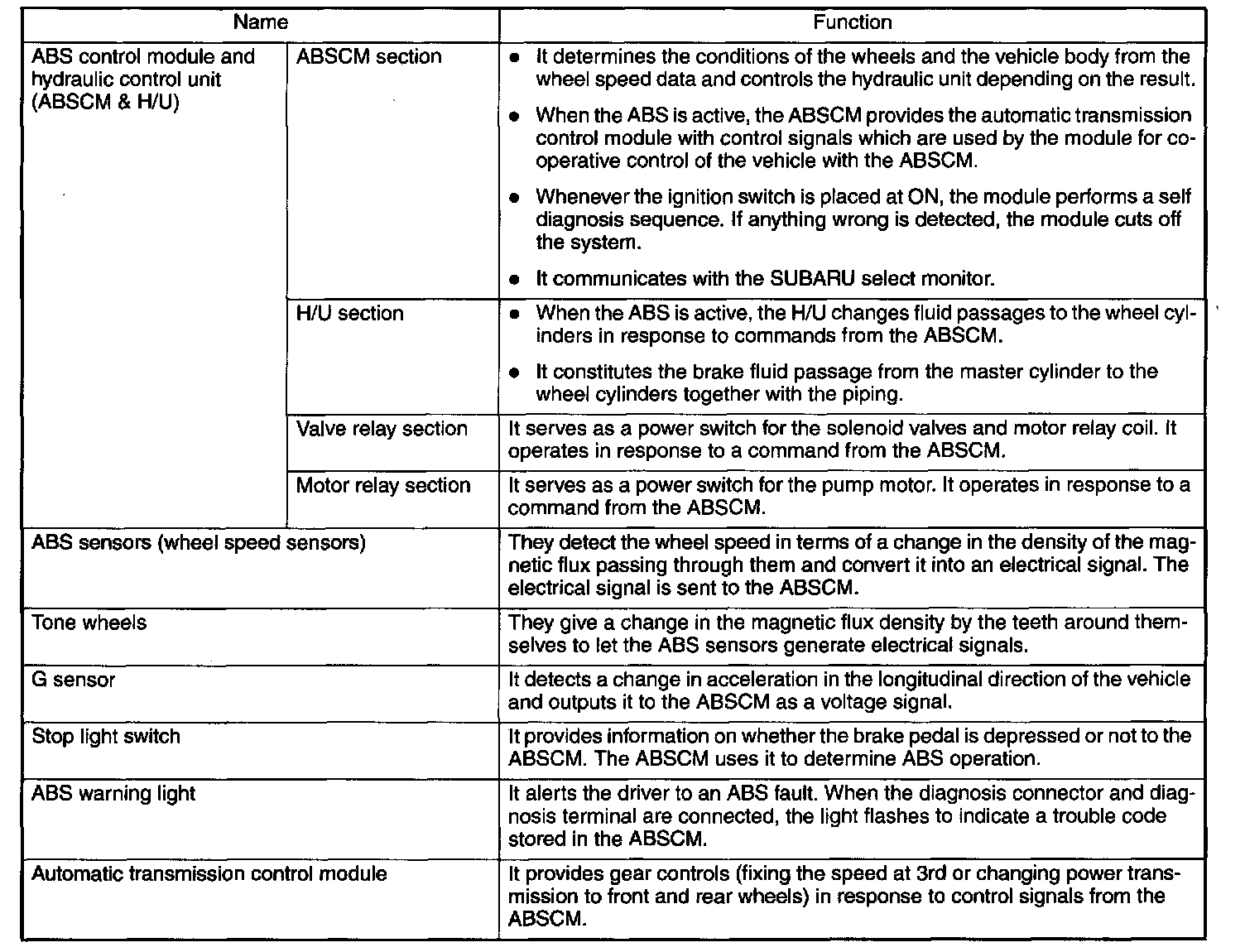 FEATURE^ The 5.3i type ABS used in the Legacy has a hydraulic control unit, an ABS control module, a valve relay and a motor relay integrated into a single unit (called "ABSCM & H/U") for circuit simplicity and reduced weight.