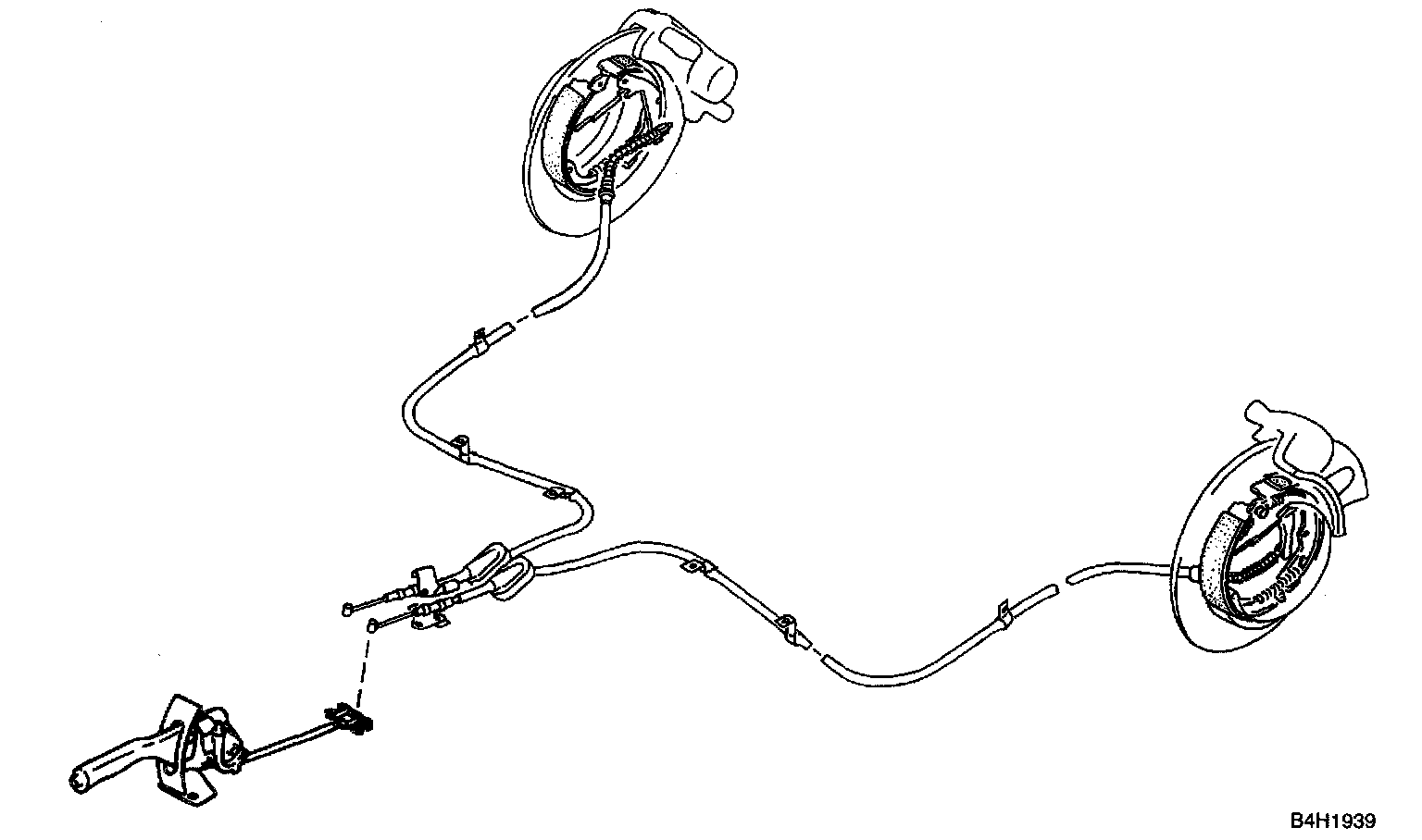 When the parking brake lever is returned to the release position and the parking brake cables are slackened, the brake shoes A and B are moved back to their original positions by the tension of return springs, so that the parking brake is released.