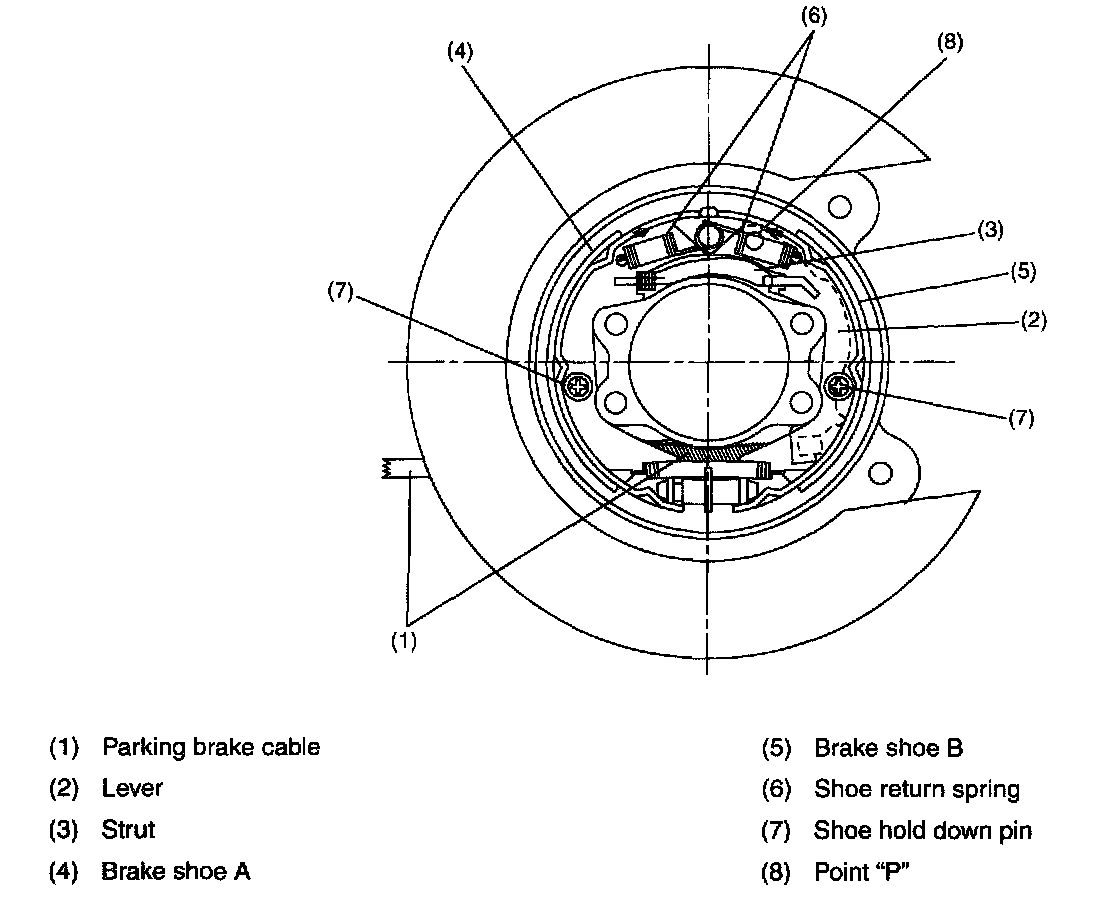 When the parking brake lever is pulled, the shoe actuating lever to which the end of the parking brake cable is connected turns the strut in direction "F" around point "P". The strut then presses the brake shoes A and B against the drum. These brake shoes utilize a floating design and are movably supported by hold-down pins. The force applied to brake shoe A and the reaction force "F" applied to the brake shoe B via point "P" press them against the brake drum.