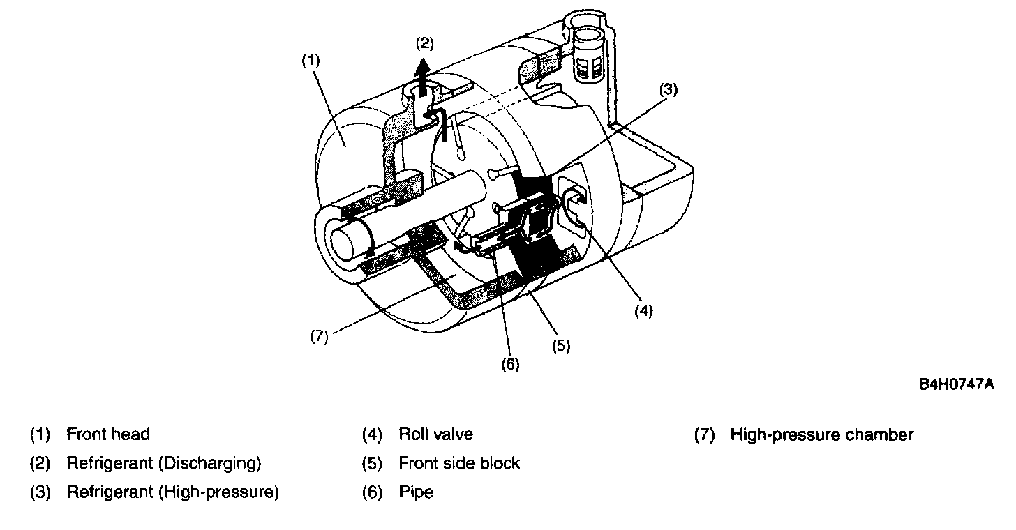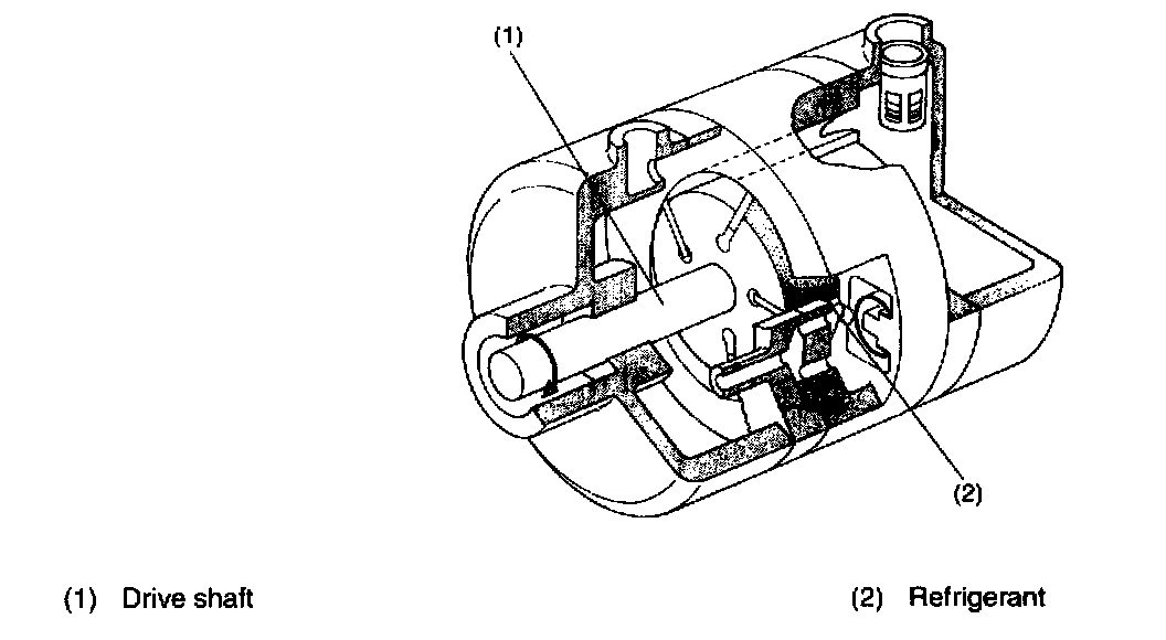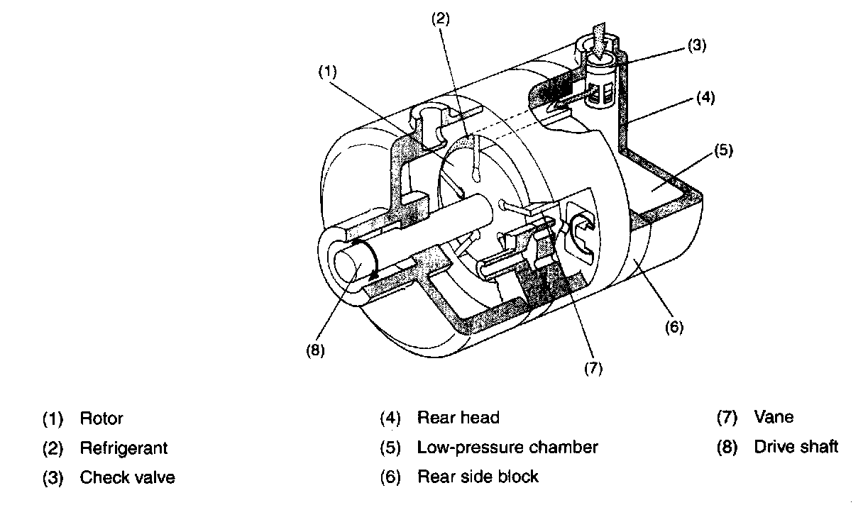 Low-pressure gaseous refrigerant is forced out from the evaporator by rotation of the compressor. It enters the low-pressure chamber in the rear head through the check valve. The refrigerant is then drawn into the cylinder by rotation of the vane-fitted rotor through the two suction ports provided in the rear side block. Air tightness of the cylinder chambers is maintained by the compressor oil.