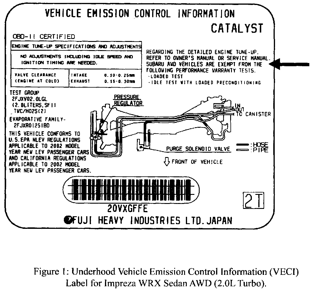 EPA has EXEMPTED all 2002 model SUBARU AWD vehicles from the enhanced I/M emission tests listed below. The exemption language is stated on the underhood Vehicle Emission Control Information (VECI) label as shown in Figure 1.