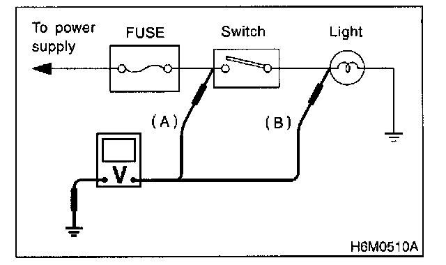 1. Using a voltmeter, connect the negative lead to a good ground point or negative battery terminal and the positive lead to the connector or component terminal.