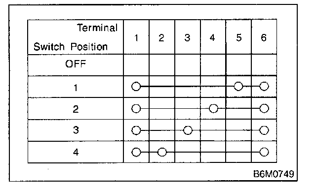 3. Symbol in the table indicates that continuity exists between two points or terminals. For example, when a switch position is "3", continuity exists among terminals 1, 3 and 6, as shown in table.