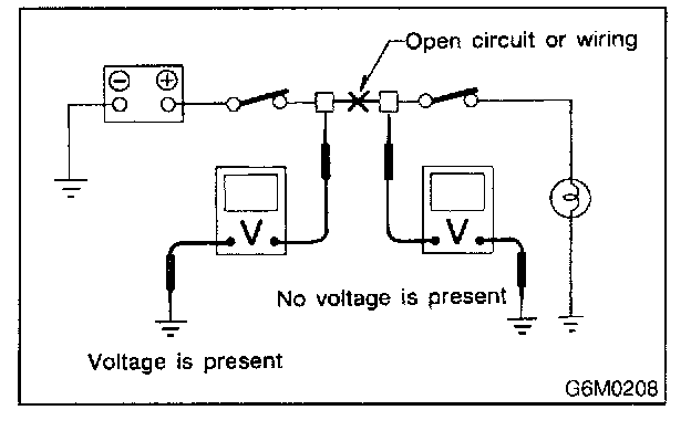 An open circuit is determined by measuring the voltage between respective connectors and ground using a voltmeter, starting with the connector closest to the power supply. The power supply must be turned ON so that current flows in the circuit. If voltage is not present between a particular connector and ground, the circuit between that connector and the previous connector is open.