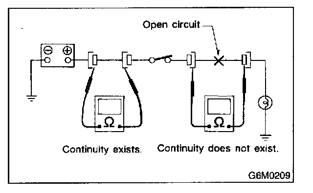 Disconnect all connectors affected, and check continuity in the wiring between adjacent connectors. When the ohmmeter indicates "infinite", the wiring is open.