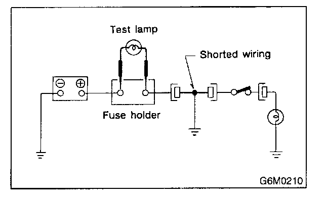 Connect a test lamp (rated at approximately 3 watts) in place of the blown fuse and allow current to flow through the circuit. Disconnect one connector at a time from the circuit, starting with the one located farthest from the power supply. If the test lamp goes out when a connector is disconnected, the wiring between that connection and the next connector (farther from the power supply) is shorted.
