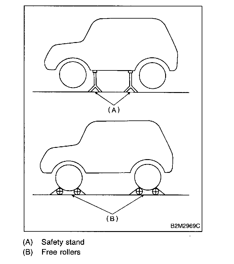 ^ In order to prevent the vehicle from slipping due to vibration, do not place any wooden blocks or similar items between the safety stands and the vehicle.