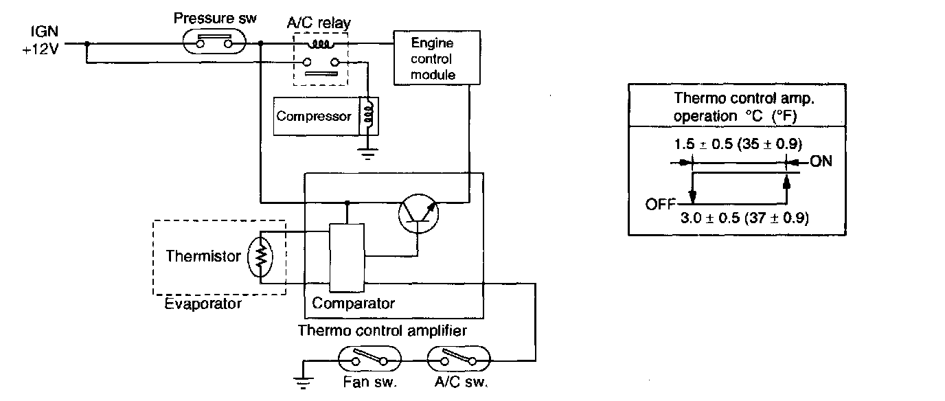 The thermo control amplifier disconnects the magnet clutch circuit to prevent the evaporator from becoming frosted when the temperature of the evaporator fin drops close to 3 °C (37 °F). When the limit temperature is reached, the thermistor (located on the evaporator fin) interrupts the base current of the amplifier. This deactivates the A/C relay, which in turn disconnects the magnet clutch circuit.