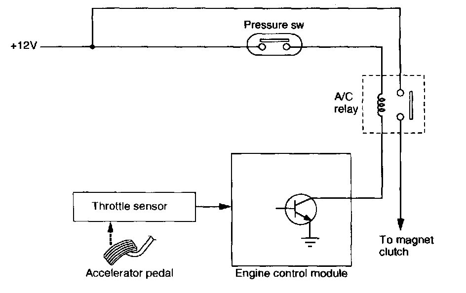 When the ECM receives a full-throttle signal from the throttle sensor during compressor operation, it deactivates the A/C relay to interrupt electric current to the compressor magnet clutch. This prevents the degradation of acceleration performance. The A/C relay is in the main fuse box located on the left side of the engine compartment.