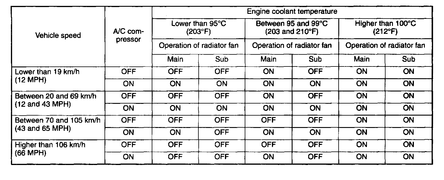 The main fan and sub fan are switched ON and OFF according to the operating modes as shown in the table.