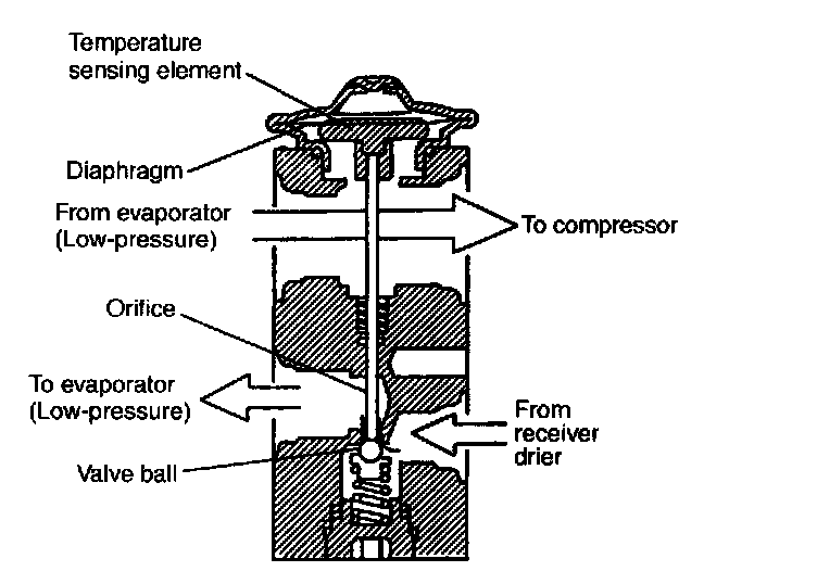 The refrigerant temperature is sensed by the temperature sensing element located in the low-pressure refrigerant passage of the expansion valve, and the flow rate of the refrigerant is controlled by changing the lift of the valve ball located in the high-pressure passage.